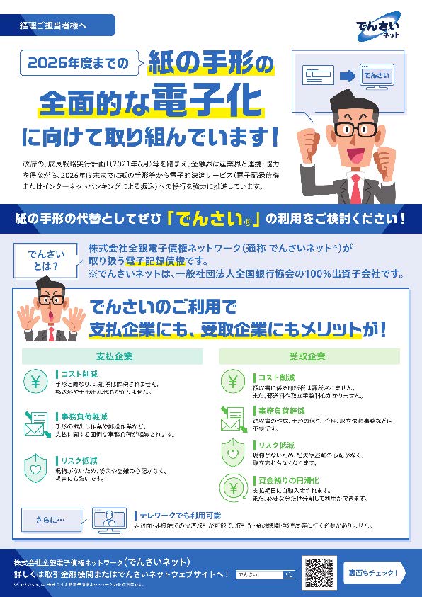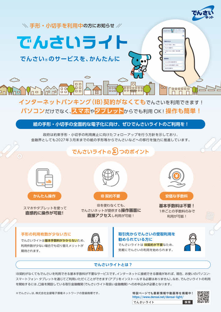 当組合では「でんさいネット」及び新たに「でんさいライト」の取扱いを開始しています。詳細につきましては、掲載しているファイルをご覧いただくか、「でんさいネットホームページ」をご覧ください。